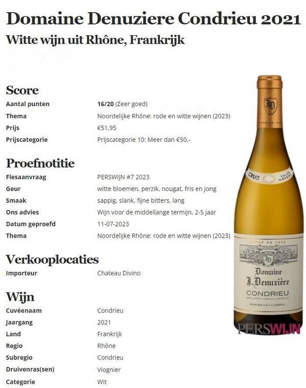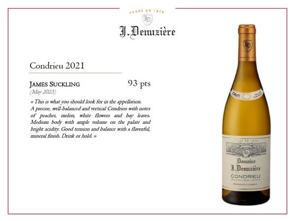 Wat Bourgogne is voor Chardonnay, is Condrieu voor Viognier: Het beste wat er aan Viognier te vinden is. De wijngaard staat aangeplant op steile hellingen met een granieten bodem. Met de hand geoogst, korte rijping in één en twee jaar oude vaten. Daarna 10-12 maanden sur lie. Volle, iets vettige witte wijn. Bloemen, perzik, mineralen. Begin 2024 komt de wijn nog wat jong over maar deze wijn kan dan ook goed ouderen.