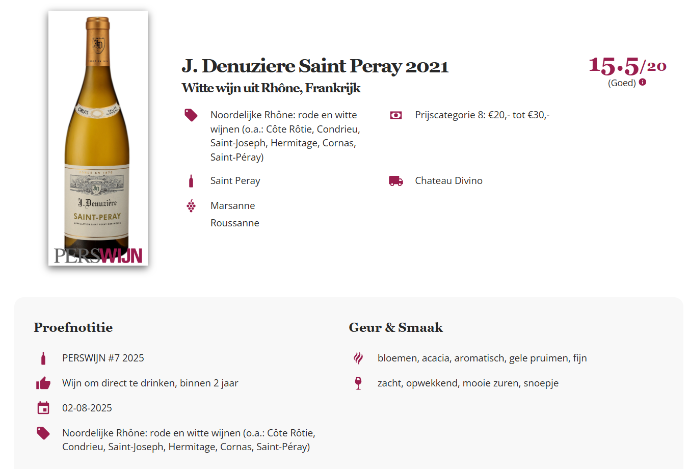 Saint Peray is een kleine appellatie in de Noordelijke Rhone waar alleen witte wijnen worden gemaakt. Deze wijn is een blend van 80% Marsanne en 20% Roussanne. De druiven staan aangeplant op een bodem van klei met kalksteen. Een prachtige volle en ronde wijn. Milde zuren, veel mineralen, vuursteen en wat tropisch fruit. 12 maanden grijpt in RVS.