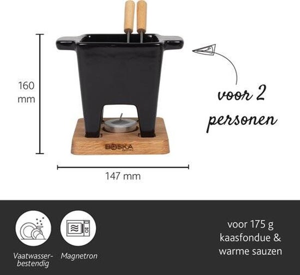 - Compact formaat: Deze mini fondue is ideaal voor 200 ml saus of 175 gram kaasfondue, wat genoeg is als maaltijd voor 1 persoon of snack voor 2 personen.